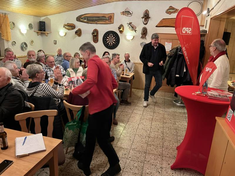 Nach dem Schlussapplaus erhielt die Referentin aus der Hand von Thomas Görlich ein kleines Geschenk. Bevor er selbst mit seinem Vortrag beginnen konnte, begrüßte er noch den hereinkommenden Landtagsabgeordneten Matthias Körner, der spontan nach einem Termin das Anglerheim besuchte.