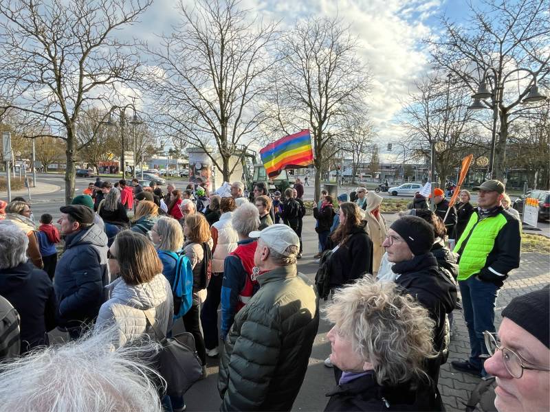 Zahlreiche Menschen mit einem breiten Alterssprektrum folgten der Einladung der Initiative. Es gab interessante Wortbeiträge, manchmal wurde das Wort, der Gesang oder der Merkzettel vom böigen Wind etwas verweht. Alles blieb friedlich.