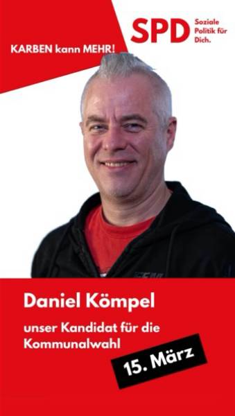 Ein "alter Bekannter" ist der Rendeler Daniel Kömpel (Platz 13). Der Diplom-Online-Journalist (FH) ist aktuell Mitglied im Ortsbeirat Rendel, er war auch bereits einige Jahre Stadtverordneter. Als Familienvater von 2 Jungs wünscht er sich ein gerechtes und für jedermann lebenswertes Karben, in dem man den Dialog sucht und nicht die Spaltung der Gesellschaft. Ehrenamtlich ist Daniel noch im Vorstand des Rendeler Eintracht-Frankfurt-FanClubs „Rantuvilre Aquilae Karben“ aktiv.